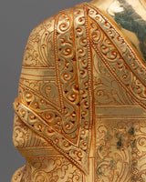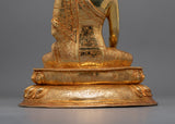 The Buddha of The Shakyas (Shakyamuni Buddha), stands at a height of 11.2 inches (28.5 cm) with a base width of 9.6 inches (24.5 cm), making it an impressive and serene presence in any space. Crafted from a copper body, the statue is adorned with 24K gold gilding that enhances its divine and radiant quality. The intricate gold and acrylic paintings bring vibrant life to the figure.