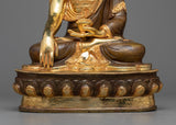 Immerse yourself in the profound peace of The Buddha Shakyamuni Statue. This magnificent item, with a 24K Gold Gilded surface over an Oxidized Copper Body, blends spiritual grace and artistic excellence. The gold and acrylic paintings add a brilliant glow to the statue, reflecting the Buddha's enlightenment. The antique treatment increases the texture and depth of the statue, bringing out its exquisite details and connecting it to Nepal's historic workmanship.
