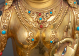 The Buddhist Deity White Tara statue stands at a height of 12.8 inches (32.5 cm) with a base width of 8.9 inches (22.5 cm), It is adorned with 24K gold gilding, gold and acrylic paintings made from a copper body. This representation of White Tara embodies her qualities of compassion, healing, and longevity, making it a spiritually significant piece for any collection or sacred space.
