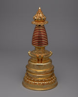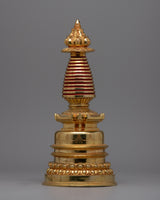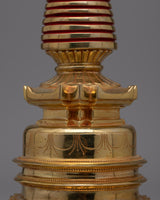 The Buddhist Stupa is perfect for collectors, art lovers, and spiritual practitioners because it is a beautiful decorative item and a potent symbol of spiritual dedication. This stupa inspires thoughtful reflection and devotion, whether placed as a major focal point in any room, on a holy altar, or in a meditation area. Its artistic beauty and spiritual symbolism enhance any surroundings, and it is a cherished piece for any collection or sacred space. The Gold Plating adds a touch of elegance and devotion, which also improves the stupa's overall aesthetic appeal. The use of Copper provides endurance.