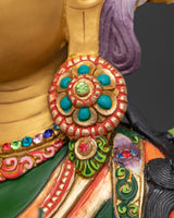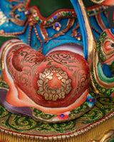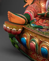 Standing at 18.9 inches in height and 13.8 inches in width, Green Tara is depicted seated in her traditional pose, with her right leg extended in readiness to help those in need. Her right hand is in the varada mudra (gesture of granting boons), symbolizing her ability to offer protection and blessings. In her left hand, she holds the utpala lotus, representing purity, spiritual growth, and enlightenment. Her serene and compassionate expression reflects her divine nature as the protector of all beings.