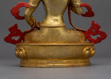 The Diamond Being Vajrasattva Statue, measuring 13.6" (Height) x 10.6" (Base) and weighing 3.55 kg, is crafted of solid copper, gilded in 24K gold, and decorated with bright gold and acrylic paints. This artwork, created by talented Nepalese artisans, shows Himalayan workmanship and is an excellent centerpiece for altars, meditation rooms, or spiritual decor.