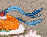 The Divine Presence of White Tara, a sublime portrayal of a female Bodhisattva revered for her profound compassion and healing powers, graces this extraordinary Thangka masterpiece. The painstaking artistry behind this work is awe-inspiring, with each meticulous detail hand-painted on a canvas of fine cotton, using a carefully chosen palette of natural stone colors. However, what truly elevates this Thangka to a divine level is the infusion of genuine 24K gold, painstakingly applied to accentuate the intricate features of White Tara and her sacred surroundings. This luxurious gold not only adds an ethereal glow but also symbolizes the purity and transcendence that White Tara represents. Gazing upon her serene visage and graceful presence, viewers can't help but be drawn into a realm of profound compassion and tranquility. The Divine Presence of White Tara Thangka is not just a work of art; it's a spiritual journey, an invitation to experience healing, enlightenment, and the limitless compassion that this Bodhisattva embodies.