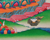 The powerful thangka features Chakrasamvara, a revered deity in the Highest Yoga Tantra tradition of Vajrayana Buddhism. He is shown united with his consort Vajravarahi, symbolizing the union of wisdom and emptiness. Chakrasamvara has a dark blue body, representing the vastness of space and the transformation of anger into mirror-like wisdom. He holds ritual implements, including the vajra and bell, surrounded by a vibrant rainbow nimbus and fiery red aureole. Below him, two subdued deities represent the overcoming of ego and ignorance. Against a lush green landscape with flowing rivers and symbolic offerings, this Chakrasamvara art piece is a radiant embodiment of tantric power, perfect for deep spiritual practice and meditation.