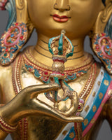 This statue, made of a sturdy copper body and expertly gilded in 24K gold, represents the radiant purity that Vajrasattva has. The magnificent paintings in gold and acrylic add layers of richness and color, depicting the minute details of Vajrasattva's clothing and the vajra (a symbol of unbreakable wisdom and clarity) he is holding. The Divine Vajrasattva Statue is a compelling meditation tool that encourages practitioners to fully participate in the cleansing and disintegration of negative karmic processes. The meticulous craftsmanship of the statue, combined with the symbolic richness of Vajrasattva's iconography, makes it a meaningful addition to any space dedicated to spiritual growth and reflection.