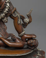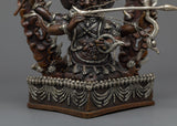 Dive deep into Buddhist spirituality with this set of Ekajati, Rahula, and Dorje Legpa sculptures, each crafted with exquisite detail. These sculptures command presence in your home or sacred area with a height of 11 inches (28 cm) and a strong base of 7 inches (18 cm). The overall weight of 9.79 kg, entirely in an oxidized copper body, emphasizes the products' lifespan and toughness.