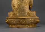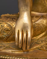 Standing at 13.6 inches in height, this Shakyamuni Buddha statue is gilded with 24K gold, imparting a luminous and sacred glow that enhances any space. The Buddha is depicted in the bhumi sparsha mudra (earth-touching gesture), with his right hand reaching down to touch the earth as a witness to his enlightenment. His left hand rests in his lap, symbolizing inner calm and meditative focus. The serene expression on his face reflects the deep peace and wisdom that comes with spiritual awakening.
