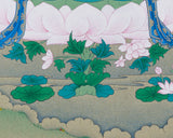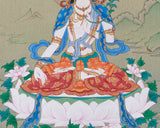 In Tibetan Buddhism and the broader Mahayana tradition, Sita Tara, also called White Tara, is regarded as a female Buddha of healing, compassion, and longevity. She is frequently called upon to guard against illness and untimely death. She is depicted in this thangka sitting elegantly on a moon disc upon a lotus seat, symbolizing spiritual purity. Her right hand is extended in the gesture of generosity (varada mudra). In contrast, her left hand holds a pundarika near her heart, an emblem of purity and the unfolding path of enlightenment.