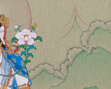 An original artwork of the female Buddha, Sita Tara Thangka, is meticulously hand-painted on fine cotton canvas using natural stone colors. It is also adorned with delicate accents made from genuine 24K gold. The use of naturally ground colors derived from minerals and stones gives the painting its soft, luminous texture. The gold highlights sacred elements like jewelry, robes, and background details. The painting adheres to the traditional Karma Gadri style, which is recognized by its open composition, flowing lines, and subtle shifts in tone. This style imparts clarity and elegance while beautifully presenting the main deity.