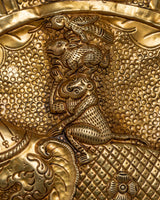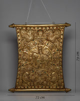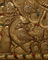 This Thangka weighs 7.04 kg, which adds to its significance in terms of both stature and symbolism. It promotes harmony and camaraderie by showing the harmony between an elephant, a monkey, a rabbit, and a bird. The intricate brass work and brilliant gemstones reflect the artistry of the craft and provide a breathtaking visual experience.