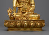 Presenting the Guru Medicine Buddha Sculpture, a calm depiction of the Buddha's healing nature. With a balanced height of 13.7 inches, a base measuring 9.8 inches, and weighing 5.70 kg, this sculpture represents the weighty presence of the Medicine Buddha's healing qualities. This sculpture, made of a copper body and embellished with 24K gold gilding and intricate acrylic paints, perfectly embodies the Medicine Buddha's healing spirit and tranquility.