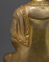 Shakyamuni Buddha religious figurine of wisdom and serenity a handcrafted masterwork that adds spiritual peace to any space. This statue, standing 14.2" tall with a 10.2" base and weighing 5.96 kg, is crafted of copper, gilded in triple layer 24K gold, and enriched with gold and acrylic paintings and deeply engraved 3D-like carvings. The vibrant detailing and craftsmanship represent the rich beauty of Nepalese Himalayan traditions, making this a significant addition to altars, meditation places, and sacred decor.