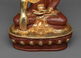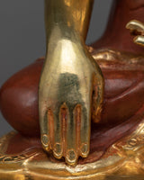 This magnificent statue portrays The Shakyamuni Buddha's profound peace and wisdom. This portrayal of Siddhartha Gautama, who reached enlightenment under the Bodhi tree, stands 13.3 inches tall, weighs 2.96 kg, and exemplifies the Buddha's transforming journey. Crafted from an oxidized copper body, the statue is embellished with 24K gold gilding and meticulous gold and acrylic paintings, creating a work that exudes The Enlightened One's radiant energy.