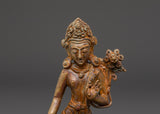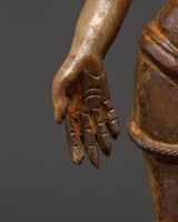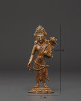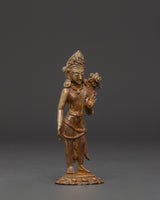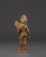 The Standing Lokeshwor, the Lord of the World, radiates boundless compassion from every aspect of his form. Known in Sanskrit as Avalokiteshvara, this bodhisattva embodies the enlightened mind of mercy and is one of the most revered figures in Mahayana and Vajrayana Buddhism. 14.5cm tall and 7 cm wide, it is skillfully carved from copper to capture Lokeshwor's tranquil and compassionate nature. This Buddhist deity sculpture, weighing around 0.36 kg, is suitable for practitioners and collectors, demonstrating traditional workmanship and creative elegance.
