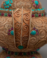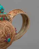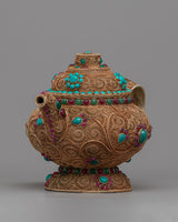 Introducing the Tibetan Tea Pot, a work of art and cultural relic. This teapot is both a work of art and a useful object with cultural significance. It is made with a copper body and exquisite gemstone embellishments.