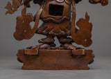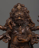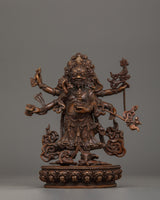 The Tibetan White Mahakala Sculpture, standing at a height of 8.3 inches (21 cm) with a base width of 6.3 inches (16 cm), features a meticulously crafted oxidized copper body. This statue captures the serene and protective essence of White Mahakala, a compassionate deity in Tibetan Buddhism. The oxidized copper finish gives the statue an aged, sacred appearance, enhancing its spiritual significance.
