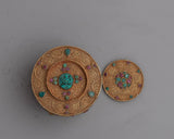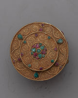 This circular treasure box is carefully constructed on a copper body and lavishly plated in 24k gold. The surface is embellished with beautiful gemstones carefully embedded to form an exquisite design. The box's lid is simple to open and reveals a large compartment that can keep little items. This wonderful work of art not only acts as a useful piece of art but also as a gorgeous decorative object that adds a sense of elegance to any environment.