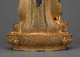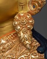The wonderful Wealth Deity Guru Orgyen Norla Statue, who represents riches and prosperity in the context of spiritual practice. This statue, which stands at a stately 13.7 inches tall on a 9-inch base and weighs 4.55 kg, honors Guru Orgyen Norla, a holy person who is thought to bring prosperity, success, and stable finances. With its intricate gold and acrylic paintings, intricate 24K gold plating, and copper body construction, this piece perfectly embodies Guru Orgyen Norla's divine grace.