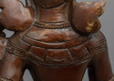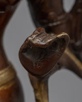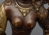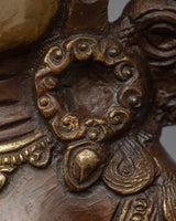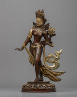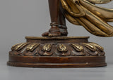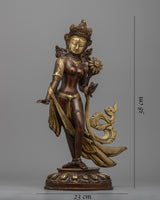 The White Tara statue is a stunning piece of art meticulously handcrafted on a brass body. This magnificent statue stands at a height of 38cm, commanding attention and radiating elegance. The White Tara deity is depicted in a standing posture upon a beautifully detailed lotus base, symbolizing purity and enlightenment. The intricate craftsmanship brings out the grace and serenity of White Tara, with delicate features and flowing robes carefully sculpted. This statue serves as a powerful representation of compassion, healing, and protection, making it a perfect addition to any sacred space or spiritual practice.