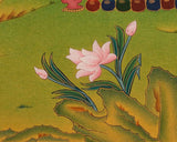 The White Tara Thangka depicts a deity with a calm face with three eyes, eyes on the palms of her hands, and the soles of her feet. These eyes symbolize her ability to perceive and comprehend the pain of all beings. Our artist depicted Tara in a scene of nature, with the mountains and rivers enhancing her natural beauty. We have hand-drawn White on a cotton canvas using poster colors. We also have used genuine 24K gold to further highlight the deity's features and as a finishing touch. We assure you that the materials used in the thangka painting are of the highest quality and will last for years. You can use this White Tara Thangka painting for various purposes, such as meditation, Buddhist rituals, and even home décor.