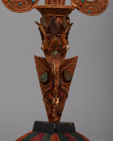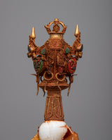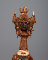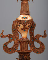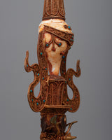 The Three-Sided Dagger, crafted with precision and devotion, represents the heart of Tibetan spiritual heritage. It displays elegance and spiritual significance, thanks to its handcrafted copper body and delicate decorations. The addition of 24k gold plating improves its beauty and spiritual resonance, bringing it to the status of a heavenly power and protection emblem.