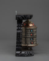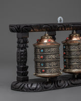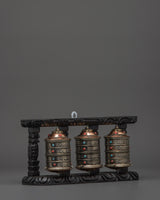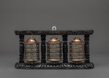 Three-Wheel Prayer Spinner in Wooden Frame | Tibetan Buddhist Home Blessing Tool