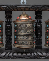 Each prayer wheel has the powerful "Om Mani Padme Hum" mantra, which symbolizes compassion and wisdom in Tibetan Buddhism. The spinners are adorned with brass, copper, and white metal, and the delicate shimmer of embedded stones adds to their appeal. This composition expresses the gifts of calm, harmony, and cleansing through movement and mindful recitation.