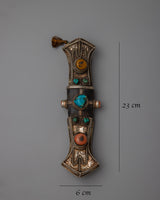 We feel honored to offer the Tibet Knife Tribal Ceremonial, an item of distinction that embodies the rich tradition and skill of Tibetan handicraft. This ceremonial knife is wonderfully matched with artificial coral and turquoise pieces. It has a white metal body with delicate silver accents. It measures 23 cm in height and 6 cm in width and weighs 0.274 kg. It is a tribute to the traditional artistry and spiritual significance inherent in Tibetan rites, measuring with a highly made pattern.
