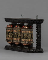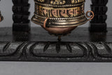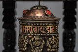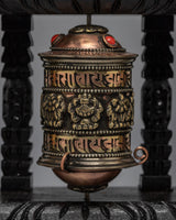 The Tibet Prayer Wheel is an integral part of Buddhist and Tibetan traditions. It is a beautifully crafted, hollow metal cylinder mounted on a rod or stand. The interior of the cylinder holds tightly scrolled paper or other material filled with printed or handwritten mantras. The prayer wheel is adorned with red gemstones and features an auspicious symbol carved outer wheel. The act of spinning the prayer wheel is believed to release positive energy and blessings, making it a cherished religious artifact in Buddhist and Tibetan communities.