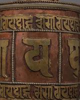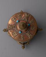 Introducing the Tibet Prayer Wheel, a stunning handcrafted object that combines the unique elegance of traditional Tibetan workmanship with a profound spiritual legacy. This beautiful prayer wheel, crafted from brass and copper, has beautiful engraved holy mantras that add to its spiritual and visual appeal. It is meant to motivate and inspire. It stands on a double vajra platform, representing the reliability of spiritual practice and the unbreakable essence of truth.