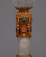 An essential part of Tibetan Buddhist ceremonies, the vajra knife represents severing ignorance and eliminating evil energies. Its spiritual resonance is increased by the addition of several valuable stones, including ruby for passion, lapis lazuli for insight, coral for vitality, turquoise for protection, and crystal for clarity. The knife's exquisite features and sparkling beauty are highlighted by the electro-gold plating, which gives a bright finish, and the accompanying stand, which offers a solid and elegant foundation.