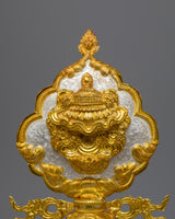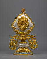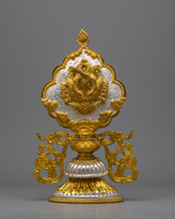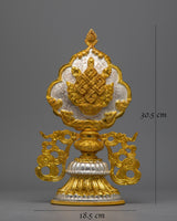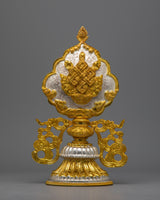 The Tibetan 8 Auspicious Symbols set is a painstakingly handmade collection that perfectly captures the stunning artistry and rich spiritual legacy of Tibetan workmanship. Because every piece in this set has a copper body and is electroplated in both gold and silver, there is a striking visual contrast that highlights the object's beauty and significance. This set is a significant and eye-catching depiction of the Eight Auspicious Symbols, measuring 30.5 cm in height by 18.5 cm in breadth and weighing 8.104 kg in total.