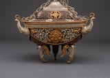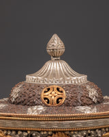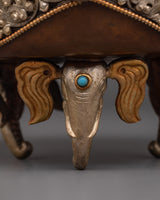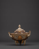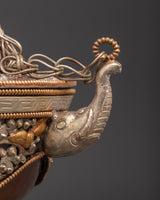 The Tibetan Altar Hanging Incense Burner showcases a complex design adorned with symbolic patterns and magnificent elephant handles, representing strength and protection. Each detail has been meticulously crafted to honor traditional spiritual symbolism. Equipped with a hanging cord, it offers both practicality and unique beauty, allowing you to easily suspend it in your ritual space. Made from durable copper and enhanced with silver and gold plating, this incense burner is not only a stunning decorative piece but also a long-lasting and essential tool for spiritual practices. It elevates your altar or meditation area by infusing the space with sacred energy and timeless elegance.