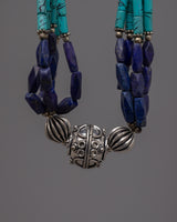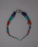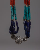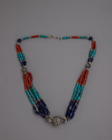 Presenting the exquisitely crafted Tibetan Beads Necklace, which blends traditional workmanship with vivid colors and materials. This necklace is formed of white metal and weighs 0.074 kilogram. It is embellished with artificial stones such as lapis lazuli, coral, and turquoise. The necklace is 29 cm long. The elaborate pattern and thoughtful stone selection are a reflection of Tibetan jewelry's rich artistic and cultural history.