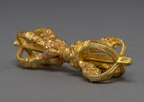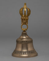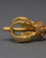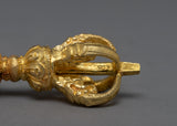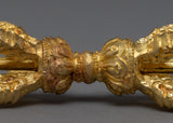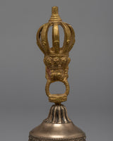 The Tibetan Bell and Dorje set is a magnificent representation of Tibetan Buddhist ritual tools. This set is beautiful, durable, and made of brass with gold plating on the Vajra. The Vajra symbolizes spiritual power and the interdependence of all things, while the Bell represents wisdom and emptiness. The handle of the Bell is designed in a half-Vajra shape, adding to the set's spiritual significance and overall aesthetic. The intricate details and high-quality material make this Vajra and Bell a truly special addition to any spiritual collection or altar. The golden finish adds a touch of elegance and enhances the beauty of this unique piece, making it an ideal choice for anyone seeking a traditional and high-quality Vajra and Bell set.