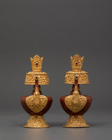 This handcrafted Tibetan Bhumba Ritual Set, which represents purification and offering sacred water, is necessary for Tibetan Buddhist ceremonies. Each piece, which is 15 cm tall, is expertly crafted from oxidized copper and elaborately decorated with intricate gold-plated patterns.