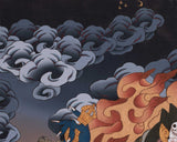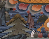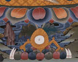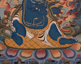 Vajrapani, a respected Bodhisattva in Tibetan Buddhism, is recognized as the protector of the Buddha and the Dharma. He embodies both wrathful and compassionate qualities of enlightenment, offering protection against negative energies and helping to remove obstacles on the spiritual journey. This thangka depicts Vajrapani with afierce expression and an energetic posture, grasping a vajra (thunderbolt) that signifies his strength and determination. His image serves as a reminder of the power of wisdom, compassion, and protection, fundamental aspects of Buddhist teachings. The thangka skillfully portrays his spiritual essence with vibrant colors and sacred gold accents, creating a striking and meaningful depiction of this significant figure.