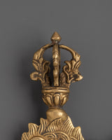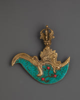 Discover the Tibetan Brass Kartika Knife, a sacred ceremonial dagger meticulously crafted to serve as both a spiritual instrument and a stunning ornamental piece. This knife is made of brass and embellished with bright artificial stone inlays of coral and turquoise. It measures 17cm in height and 16.5cm in breadth and weighs 0.36kg, making it ideal for use in meditation or ceremonial rites. Its intricate craftsmanship and symbolic design make it an excellent addition to any collection of Himalayan decor or Buddhist ceremonial instruments. This tantric dagger is not only a beautiful piece for spiritual practitioners, but also a potent symbol of protection and cleansing.