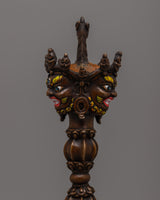 With the help of our Tibetan Buddhist Dorje Phurpa Vajra Dagger, set off on a path of spiritual protection and wisdom. This sacred dagger is handcrafted from oxidized copper, a symbol of strength and tenacity, with great attention to detail. Reaching a towering 30 centimeters, it radiates strength and mystery and is a powerful instrument for spiritual seekers.