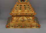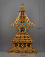 This spectacular Tibetan Buddhist Enlightenment Stupa is a work of sacred art, skillfully created on a solid copper body with a sheet base gilded in bright gold. It displays ageless beauty and profound spiritual meaning, decorated with original stones such as coral, turquoise, and lapis lazuli. This stupa stands 109 cm tall and 63 cm wide, weighing a massive 29.03 kg, indicating its long-standing presence as a symbol of enlightenment and liberation. The stupa is revered in Tibetan Buddhism as a symbol of the Buddha's enlightened mind and serves as a sacred alter to inspire devotion, mindfulness, and virtue growth.