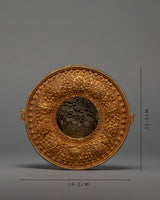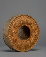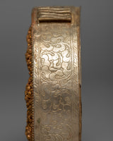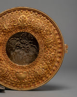 Our intricately carved, extensively ornamented Tibetan Buddhist Ghau Box is constructed of solid copper and is plated in pure gold. Beautiful Ashtamangala sculptures that represent growth and wealth can be seen in this box. This gold-plated box will be a wonderful gift for you, your friends, family, and companions.