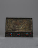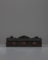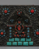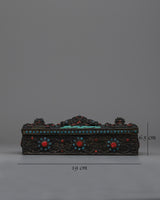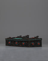 This Traditional Tibetan Buddhist Jewelry Box is more than just a storage container; it is a spiritual vessel created to house your most precious memories. Handcrafted from brass and inlaid with artificial coral and turquoise, this beautiful jewelry box adds a spiritual touch to your collection. Its sacred Buddhist design converts this piece into a protection and positive energy symbol, giving it an ideal home for your precious jewelry.