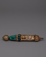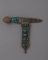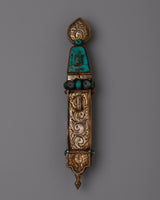The Tibetan Buddhist Knife is meticulously made on a copper body and brilliant silver plating. This combination of materials increases the knife's longevity and adds to its outstanding aesthetic appeal. Coral and turquoise stones are inlaid into the handle, chosen for their cultural value and spiritual meaning in Tibetan Buddhism.