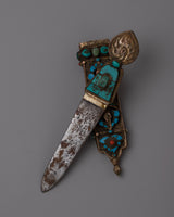 Historically, knives like these have had a variety of functions in Tibetan culture, ranging from functional instruments to ceremonial artifacts used in ceremonies and offerings. They embrace traditional values and traditions while also representing workmanship and spiritual dedication. Beyond their mechanical purpose, such knives are frequently admired for their elaborate designs and the spiritual ideals that inspired their creation. The Tibetan Buddhist Knife, whether displayed as a symbol of cultural heritage or used in ceremonial rites, represents a meaningful relationship to Tibetan traditions and beliefs, making it a valuable artifact for both collectors and practitioners.