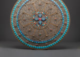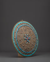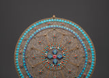 This Tibetan Buddhist Mandala Wall Hanging is a one-of-a-kind work of art that adds peace and harmony to any area. It has a stunningly ornate design that represents calm and spiritual enlightenment, and it was created with care and precision. This mandala is made of copper and adorned with artificial turquoise and coral stones, which are noted for their bright colors and cultural importance. The design is a great blend of traditional Tibetan craftsmanship and modern artistry, making it an excellent focal point for your home or business.