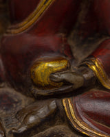 Milarepa's imagery has profound metaphorical meaning. He is shown holding his right hand to his ear while seated in a dynamic yet contemplative position, signifying his intense practice of hearing the lessons and passing forth knowledge via singing. He holds a bowl in his left hand, which stands for material and spiritual nourishment. His austere lifestyle, which emphasizes the sacrifice of material attachments, is reflected in his modest robe with little embellishment. Deer hide, which stands for protection, good fortune, and spiritual harmony, are used to embellish the throne.