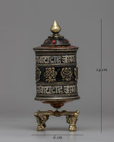 The prayer wheel's metallic finishes add to its durability and spirituality, making it a classic complement to any sacred location. Its portable design and spiritual meaning enable practitioners to eliminate negative energies, accumulate merit, and develop their meditation practice. Whether utilized ritually or as a meaningful decor piece, this artifact exudes harmony, knowledge, and dedication.