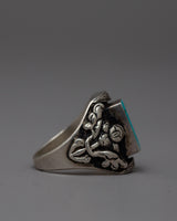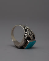 This exquisitely handmade Tibetan Buddhist ring, composed of 98% silver and 2% copper, showcases the exquisite artistry and rich cultural legacy of Tibetan handicraft. The bright touch of a single artificial turquoise stone inset at its center enhances the ring's spiritual importance. This ring is more than just a fashionable piece of jewelry—the turquoise stone, frequently linked to healing and protection, adds significant meaning for the wearer.