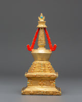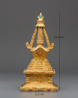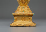 This Buddhist stupa, made of copper and plated with exquisite gold, exemplifies Himalayan craftsmanship at its finest. The dome, spire, and base are intricately crafted to follow traditional symbolism, with each component representing a stage of the Buddha's path to awakening. Practitioners frequently consecrate stupas with relics, mantras, or offerings, transforming them into vessels of merit and spiritual force. This Tibetan Buddhist Shrine Stupa, ideal for altars, meditation rooms, monasteries, or as a thoughtful gift, has profound spiritual significance. It improves meditation practice, serves as a reminder of compassion and knowledge, and sends positive energy into your environment. Adding this gold-plated copper stupa to your holy place enriches your spiritual journey while also honouring centuries of Buddhist heritage.