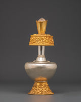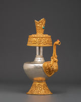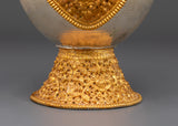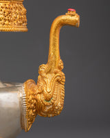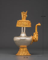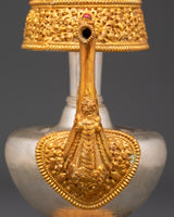 Water is essential in both Hindu and Buddhist rites, and it is always present on the altar, either in a pricey pot or in another container. Bhumba is a pot shaped like a flat jar, featuring a pipe to draw out the water from the pot, which is elaborately embellished with valuable stones and metal.